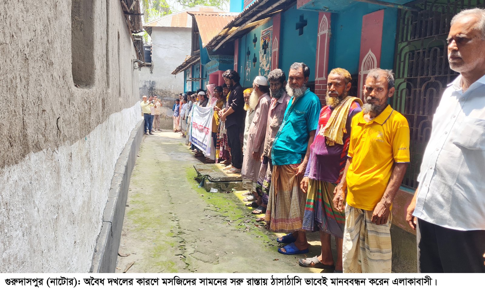 শুক্রবার বেলা ১১টায় উপজেলার রুহাই গ্রামের চকপাড়ায় এস্কে মাহাবুব জামে মসজিদের সামনে অনুষ্ঠিত মানববন্ধনে ওই অভিযোগ করেন এলাকাবাসী| অবৈধ দখলের কারণে মসজিদের সামনের সরু রাস্তায় ঠাসাঠাসি ভাবেই মানববন্ধন করেন তারা|